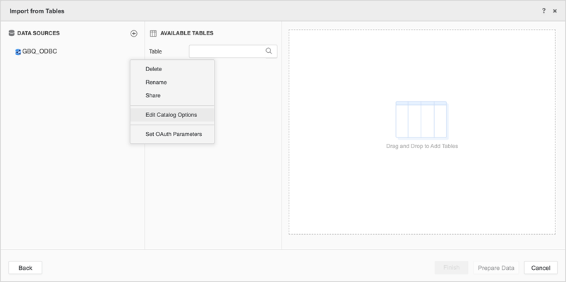 Hover over the data source, click the arrow, and choose Edit Catalog Options.