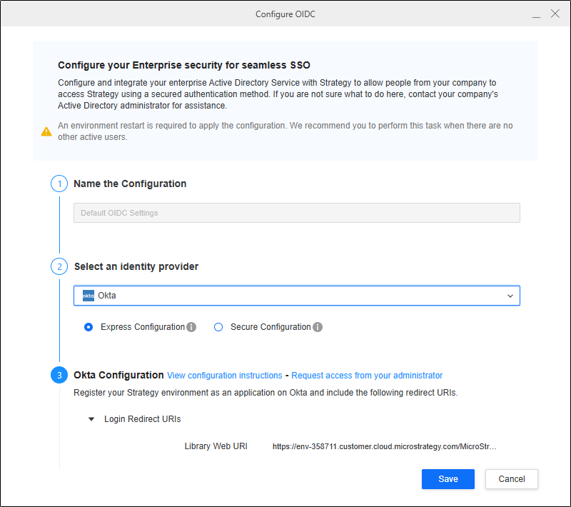 Complete the steps in Enable OIDC Authentication for Strategy Library to configure OIDC for your Strategy environment.
