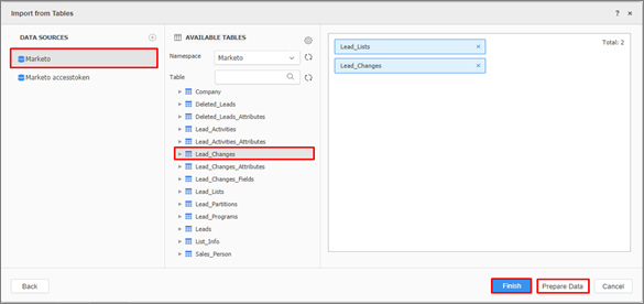 After creating and connecting to the Marketo data source, you can retrieve data through JDBC and then publish a cube for dashboards, reports, and documents.