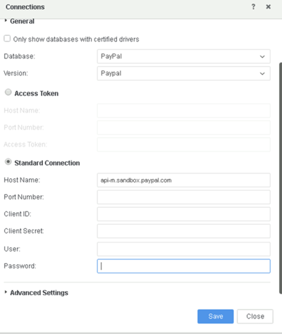 JDBC;DRIVER={com.simba.paypal.jdbc42.CLJDBCDriver};URL={jdbc:paypal://;host=[host];port=[port];Auth_Type=OAuth 2.0;Auth_AccessToken=[Access_Token]}