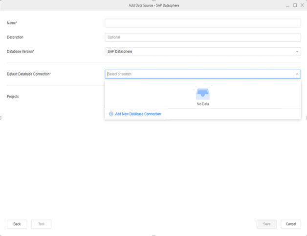 - In the Add Data Source window, enter a Name, Database Version, and optionally choose Projects for further data manipulation.