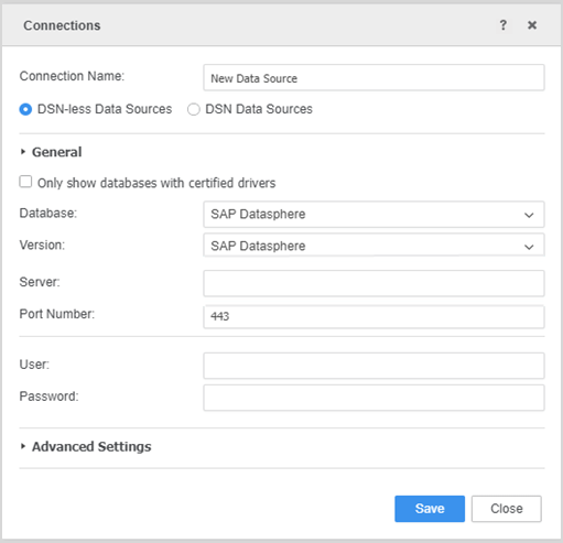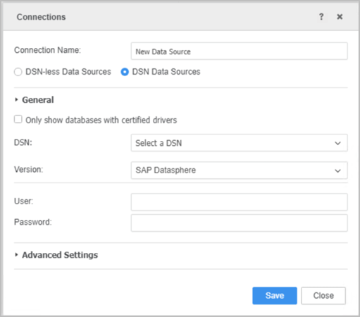 - DSN connection: Select DSN Data Sources and choose a DSN from the drop-down. Enter a Name, Server, User, and Password.
