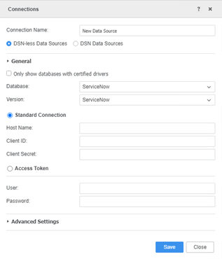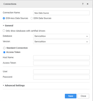 - In the Data Source interface, select DSN-less Data Source and choose ServiceNow for both Database and Version. Use one of the following methods to configure the DSN-less connection: