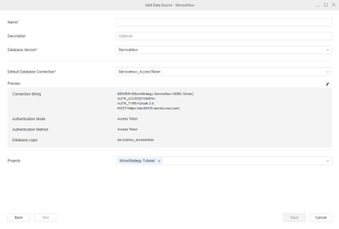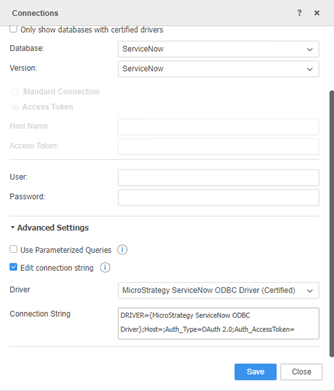 DRIVER={MicroStrategy ServiceNow ODBC Driver}; Host=@hostname;Auth_Type=OAuth 2.0;Auth_AccessToken=@token