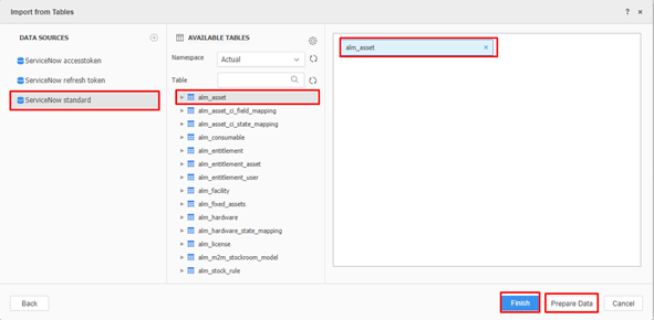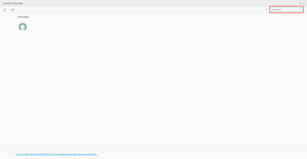 After creating and connecting to a ServiceNow data source, you can retrieve data through ODBC and then publish a cube for dashboards, reports, and documents.
