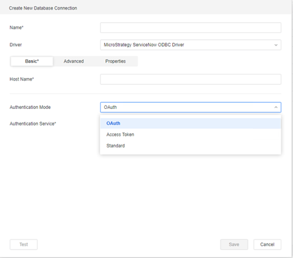 Strategy ships the ServiceNow ODBC driver to connect ServiceNow as a data source with the following connection methods. You can find them on the data source dialog when importing data.