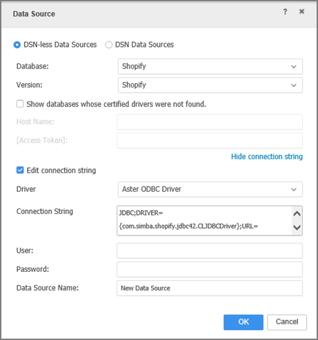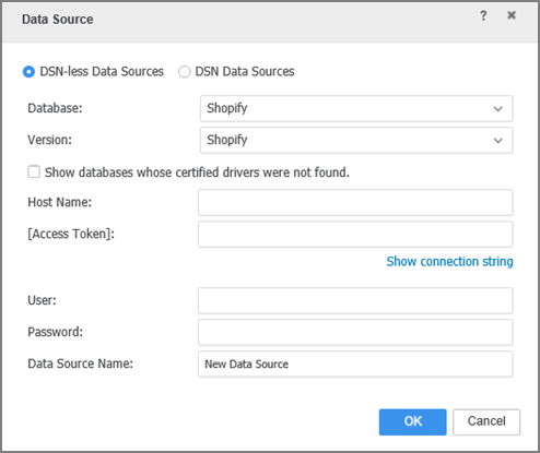 - In the Data Source interface, select DSN-less Data Source and choose Shopify for both Database and Version. Use one of the following methods to configure the DSN-less connection: