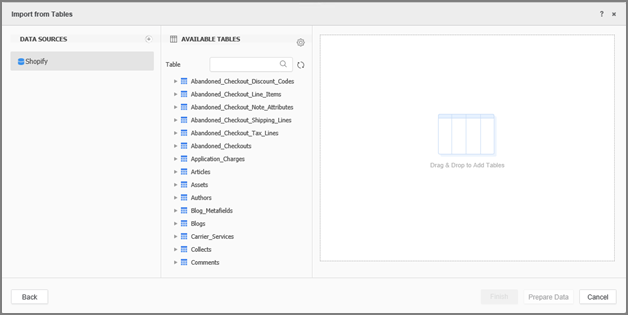 - Click your Shopify data source and select the tables you want to import.