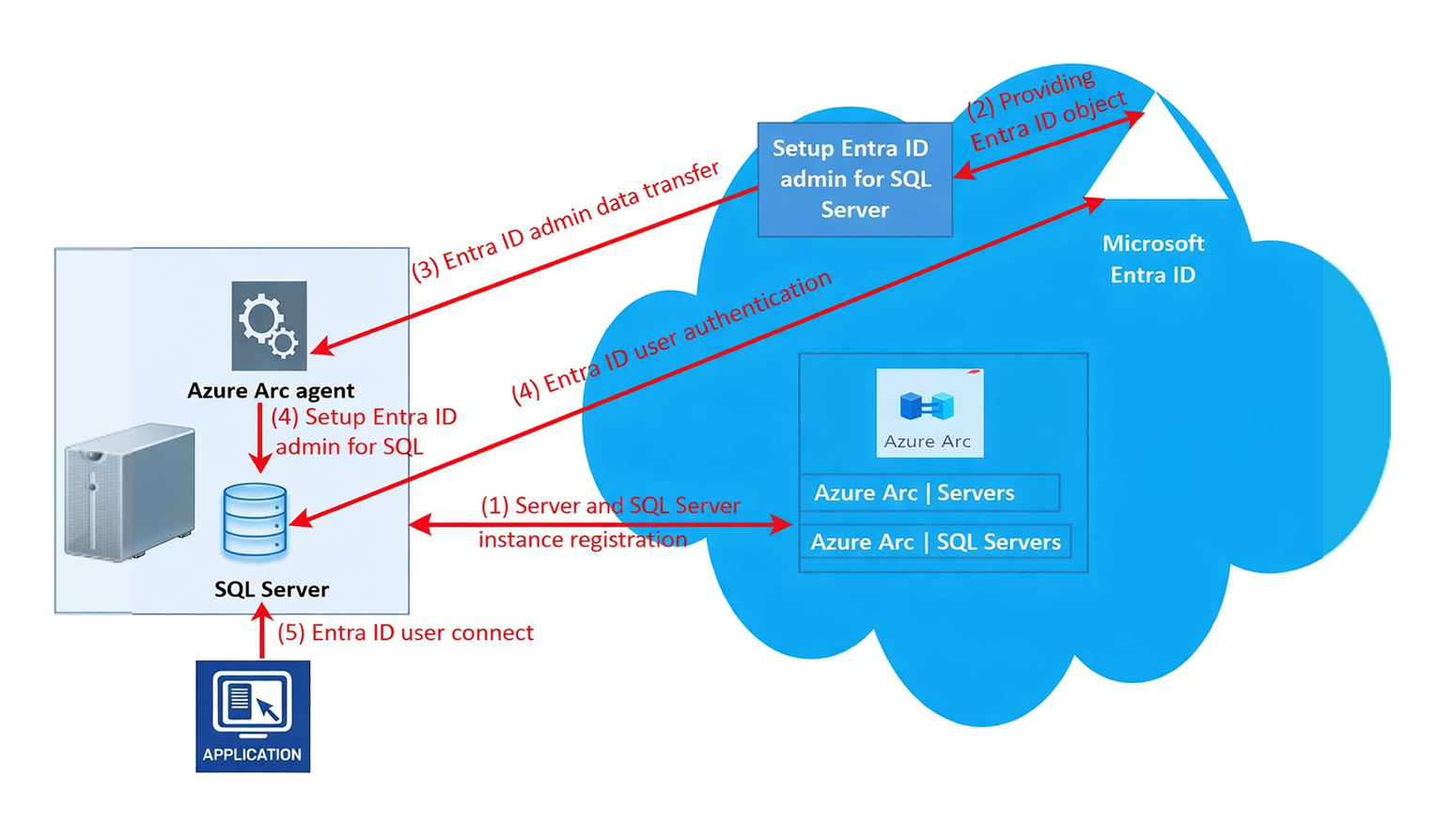The following diagram displays the two stages required for a SQL Server 2022 instance to support Microsoft Entra ID authentication using Microsoft Entra ID/Azure Arc setup and Microsoft Entra ID user authentication configuration and validation.