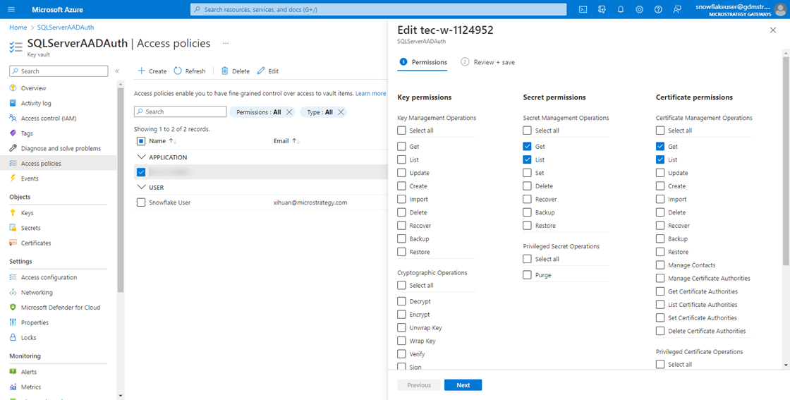 In Permissions under Secret and Certificate permissions, select the check box next to the permissions you want to add for the certificate. You must add Get.