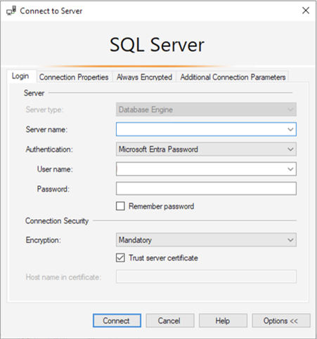 Using your Azure Entra ID authentication, connect to SQL Server Management Studio (SSMS) and a native SQL client library or driver that supports Azure Entra ID authentication.