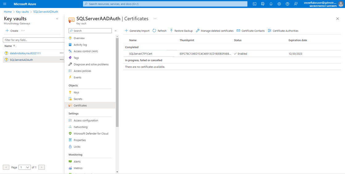 Upload the certificate you created in Create Certificate in Azure Key Vault.