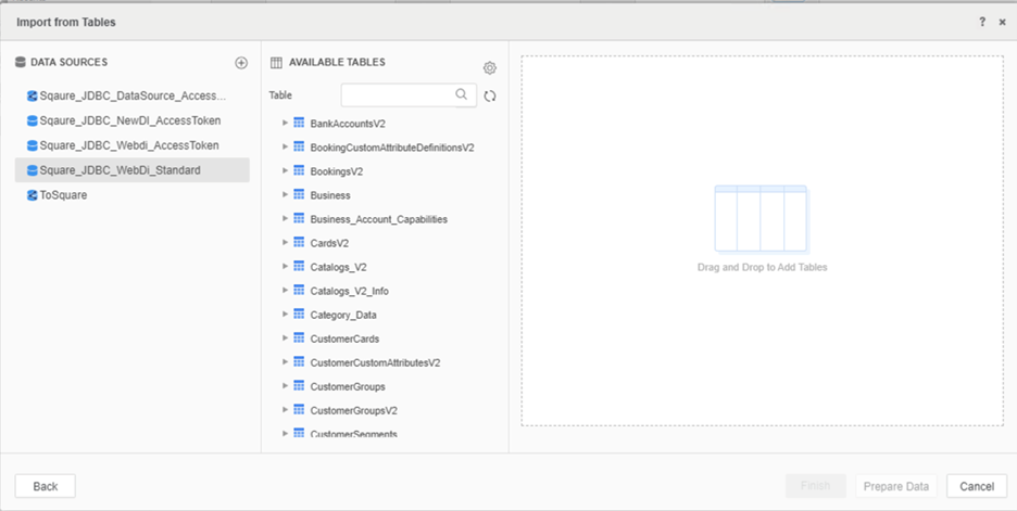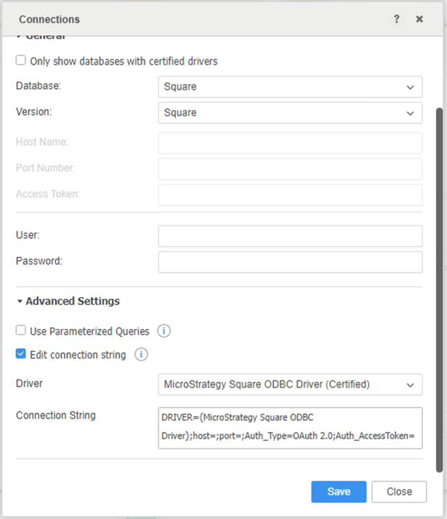 Starting in MicroStrategy ONE Update 12, a Square ODBC driver is used to connect to Square to import data on Web and Workstation, rather than a JDBC driver.