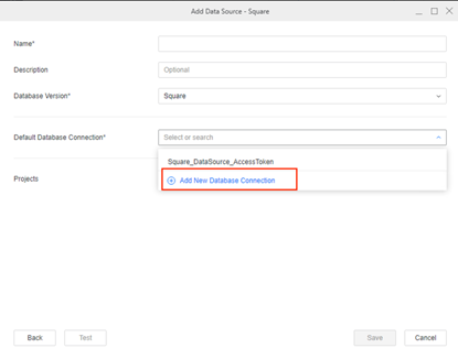 4. In the Data Source interface, select DSN-less Data Source and choose Square for both Database and Version. Use one Access Token to configure the DSN-less connection: