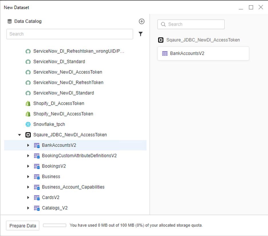 Strategy ships the Square ODBC driver to connect Square as a data source using Access Token. You can find it on the data source dialog when importing data.