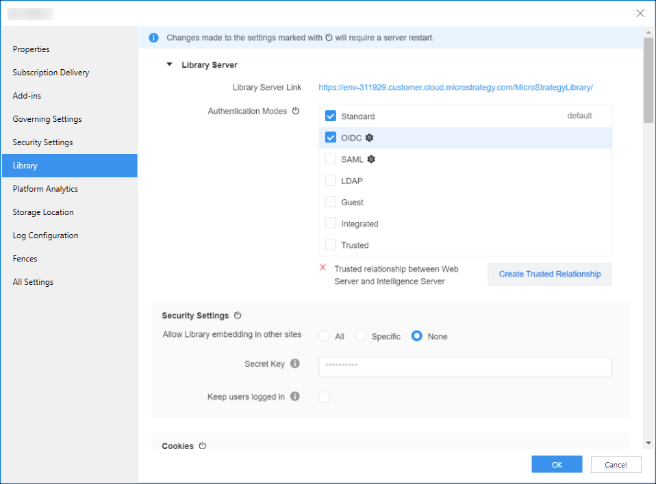 - Go to the Library Server tab and under Authentication Modes, select the OIDC check box.