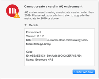 Esse aviso aparece na seção Cartões do Workstation quando você tenta conectar um Library Server 2019 a uma versão mais antiga do Intelligence Server. Você deve conectar o Library Server a um Intelligence Server 2019 ou mais recente.