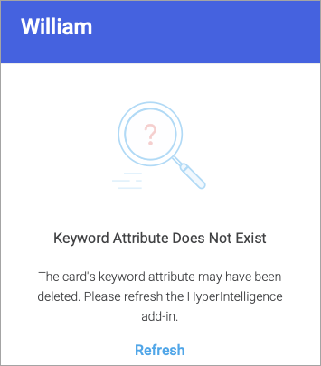 Esse erro aparece quando você habilita um cartão que não tem um atributo de palavra-chave. Para usar o HyperIntelligence, os cartões exigem um atributo de palavra-chave. Para obter instruções, consulte Criar cartões