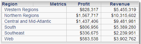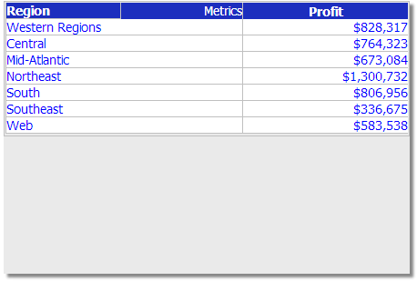 - Dataset 1 is a Regional Profit report, containing the Region attribute and the Profit metric. The derived element Western Regions is defined on Region, with the following elements: