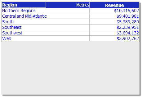 - Dataset 2 is a Regional Revenue report, containing the Region attribute and the Revenue metric. The following derived elements are defined on Region: