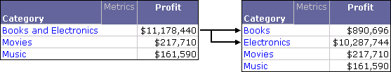 For example, in a report with Category and Profit, you create a Group derived element that combines the Books and Electronics attribute elements. You choose to keep the individual options separate, which displays the separate attribute elements in the report, as shown below.