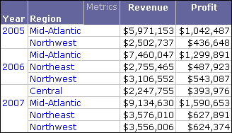 Notice that only two rows of data are returned. The metric qualification has been evaluated at the level of the report grid, which is Year and Region. This gives you a view of data within the top 10% of profit for the data displayed on the report grid.
