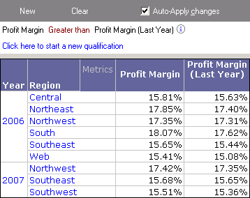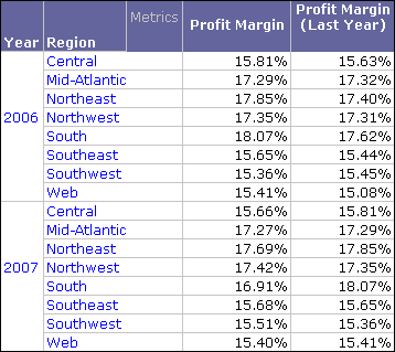You can now review when regions had increases in profit margins. For example, from the report above you can determine that the Northwest and Southeast regions have shown increases in profit margins from 2006 to 2007.