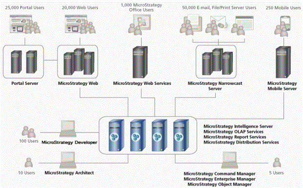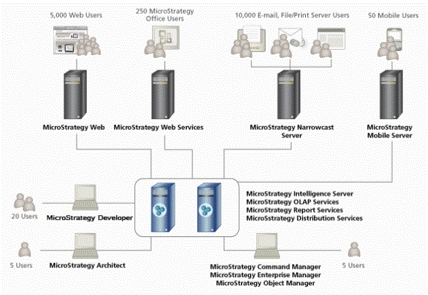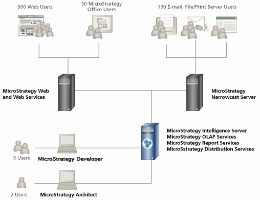 There are a countless number of possible arrangements for all the products available on the Strategy platform, and what you decide to do depends largely on your installation environment and requirements. In general, though, the following recommendations are usually true for a typical business intelligence system: