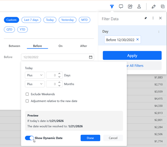 • You can create a quick dynamic date filter by selecting one of the other options, such as Last 7 Days, Today, or MTD. For steps, see Filter a Chapter by Creating a Quick Dynamic Date.