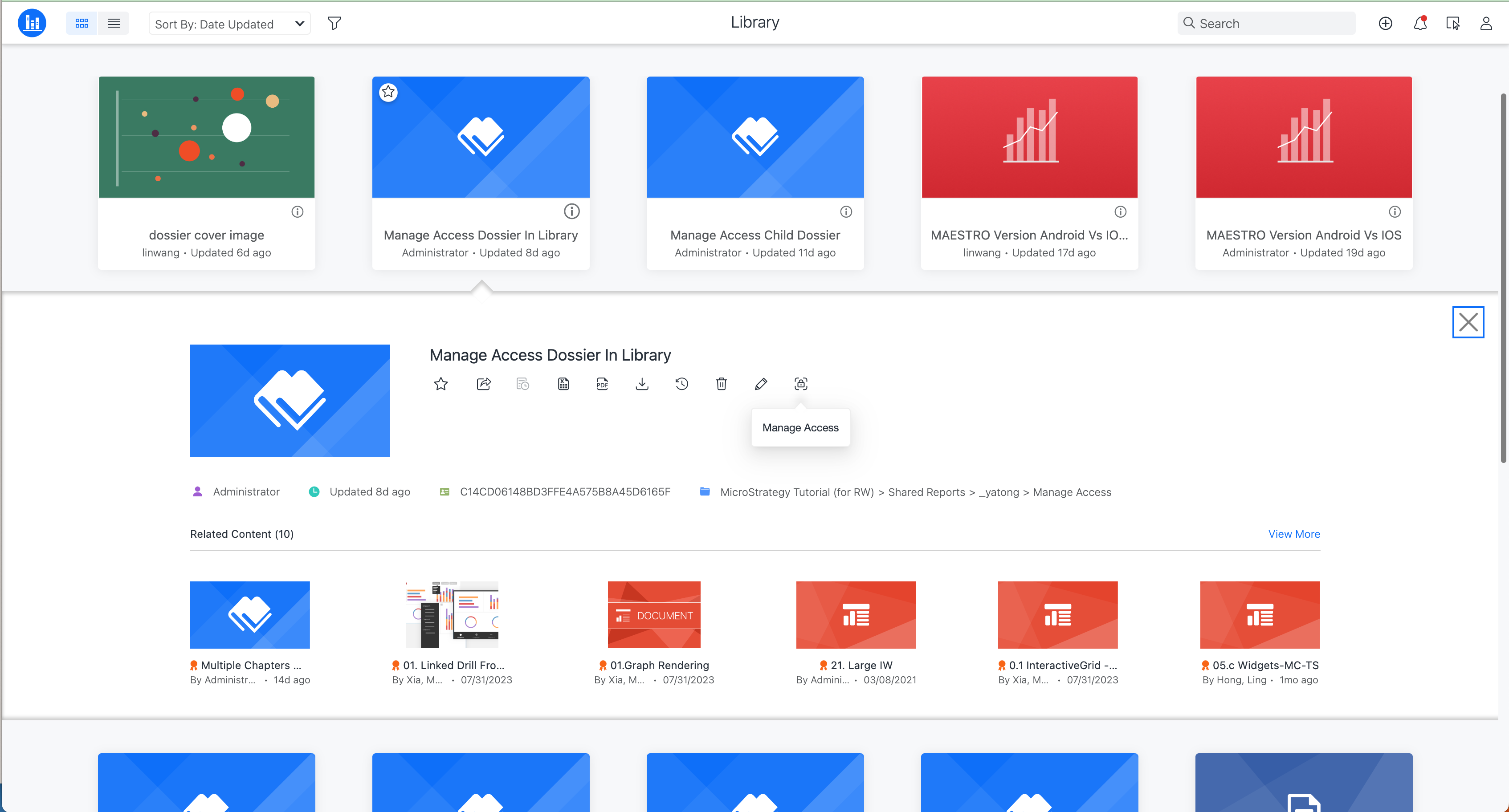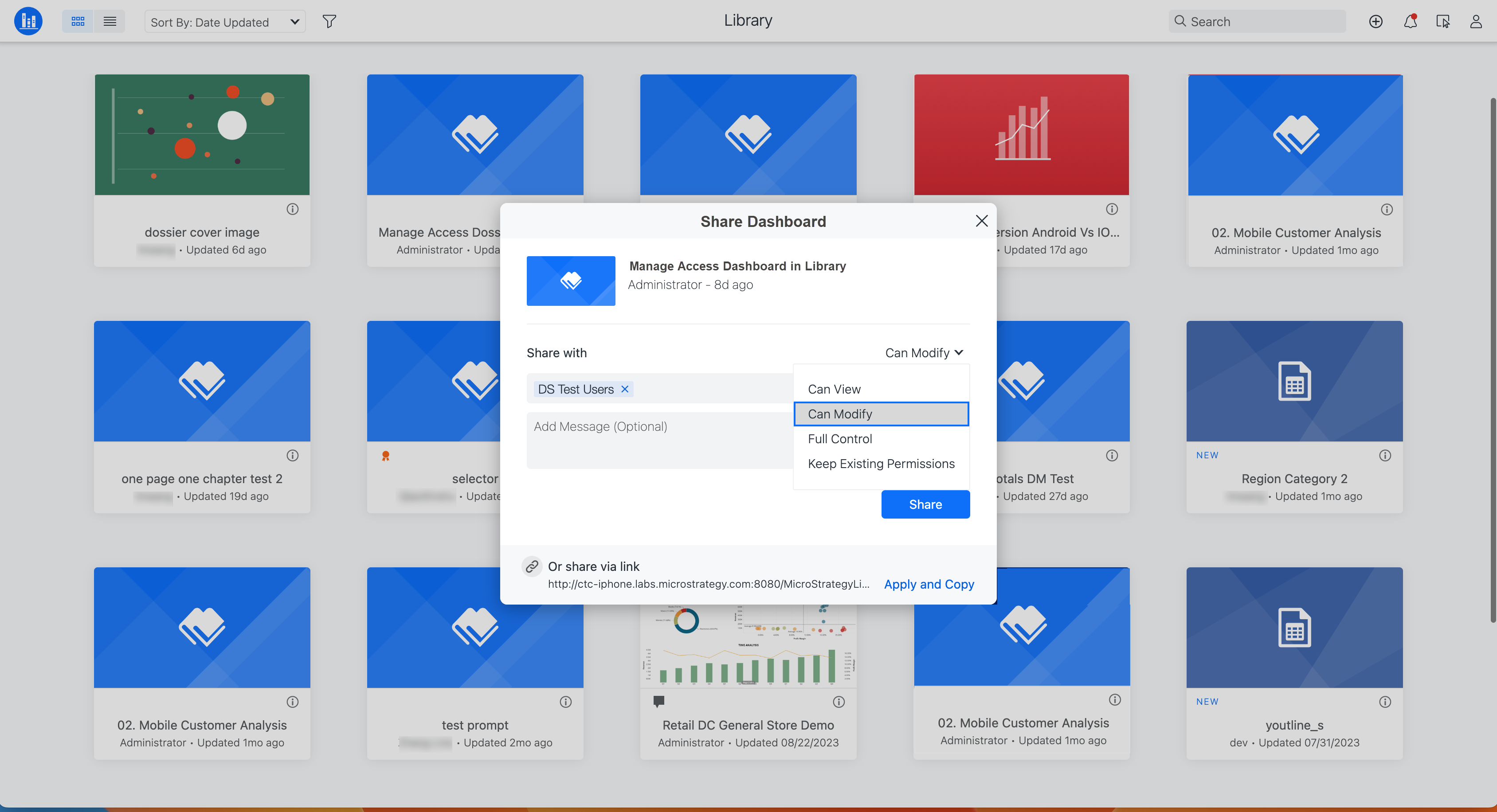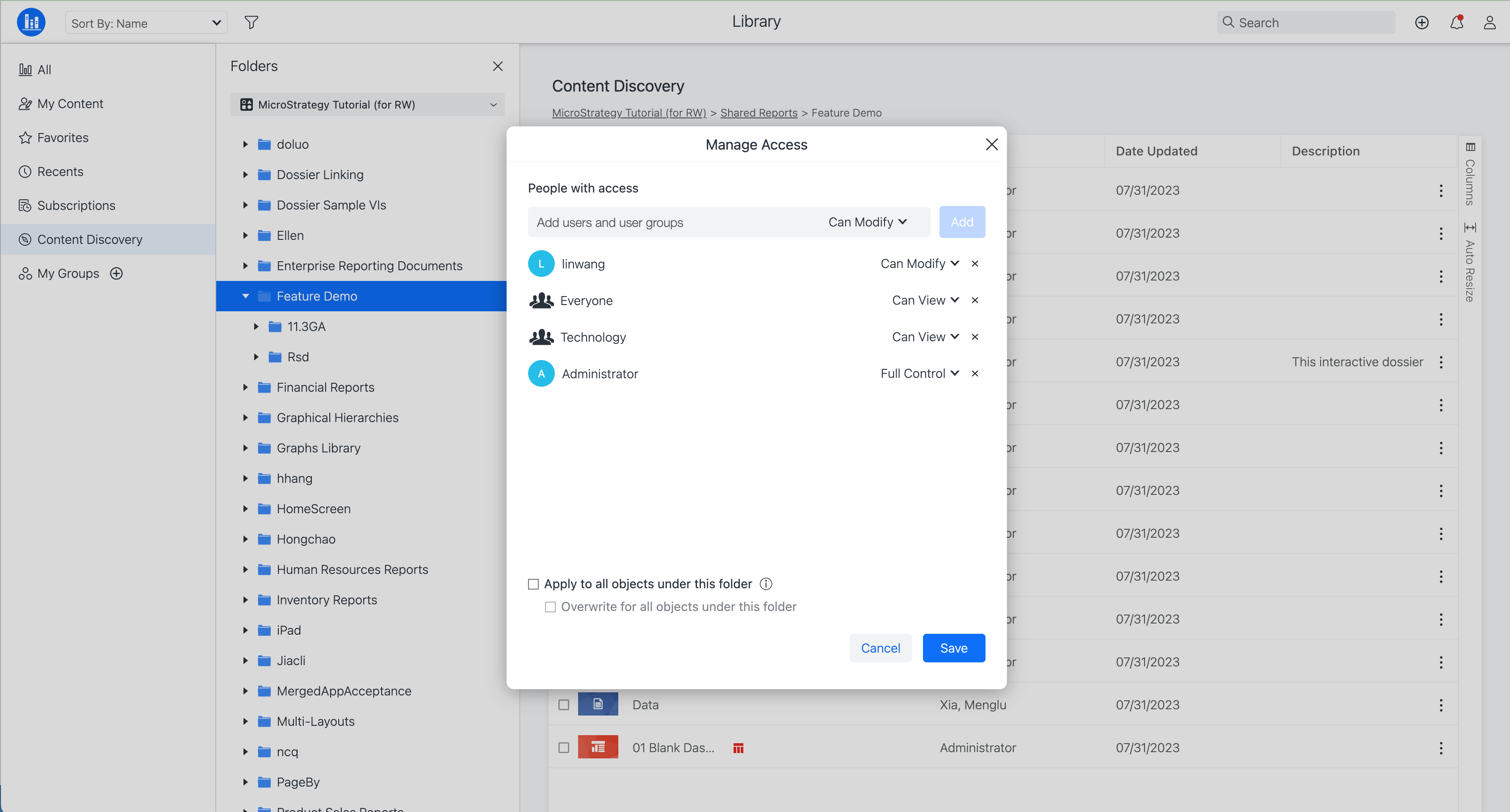 Starting in MicroStrategy ONE Update 12, you can manage access for all objects, such as dashboards, reports, documents, agents, and folders in Strategy Library. You can also grant permissions to specific users when sharing these objects.