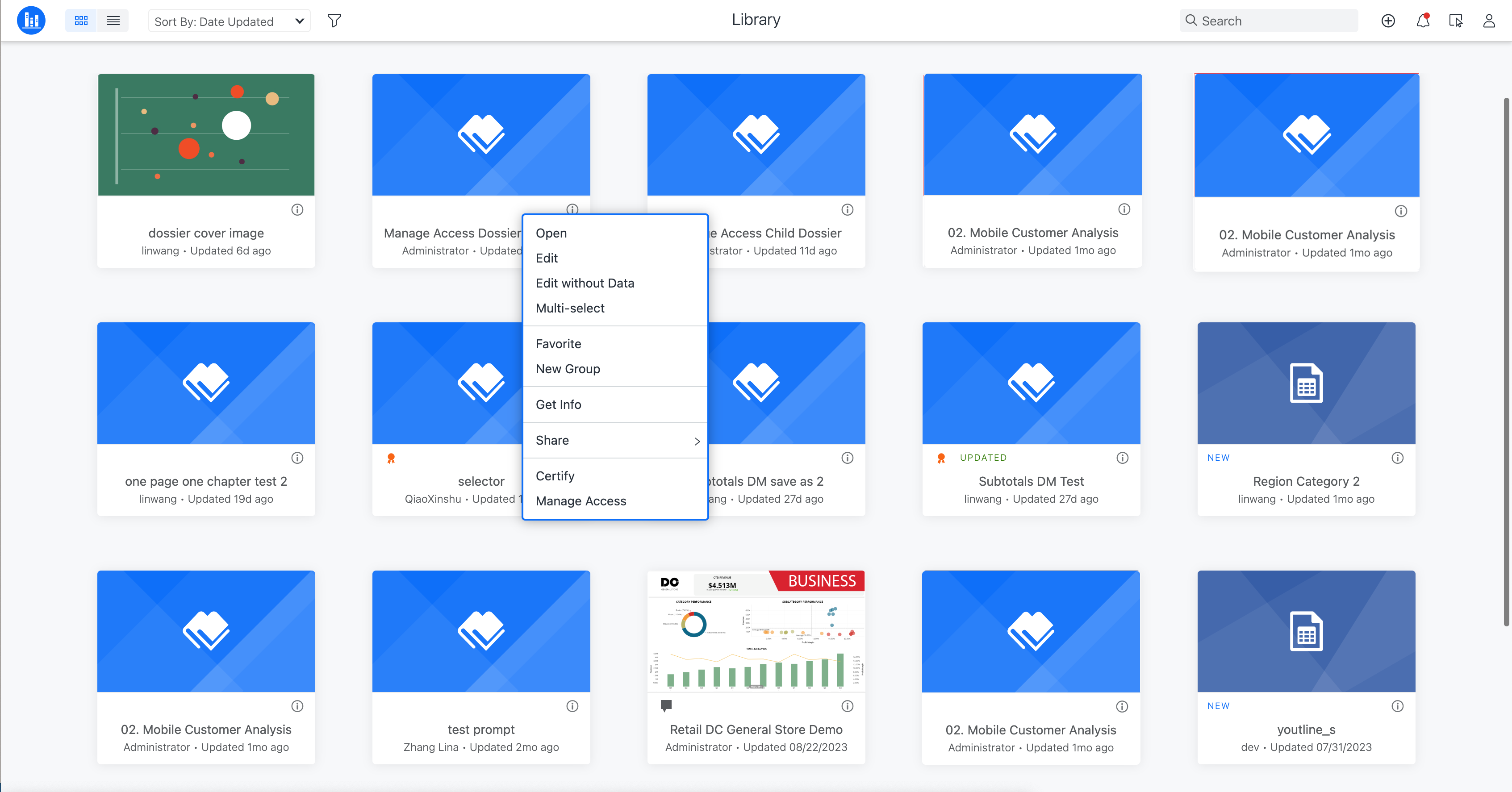 A user with full control can manage security access in Library Home, Search, Content Discovery, and Consumptions mode. There are several options to open the Manage Access dialog:
