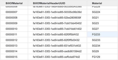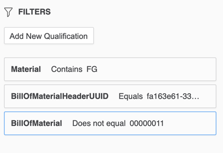 Para el siguiente ejemplo, considere una situación en la que desee recuperar filas que contengan la cadena, FG, en la columna Material y el valor de BillofMaterialHeaderUUID es igual a fa163e61-33f2-1ed9-bd85-82f0ff5b432.