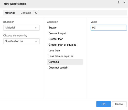 Para el siguiente ejemplo, considere una situación en la que desee recuperar solo las filas que contienen la cadena FG, en la columna Material.