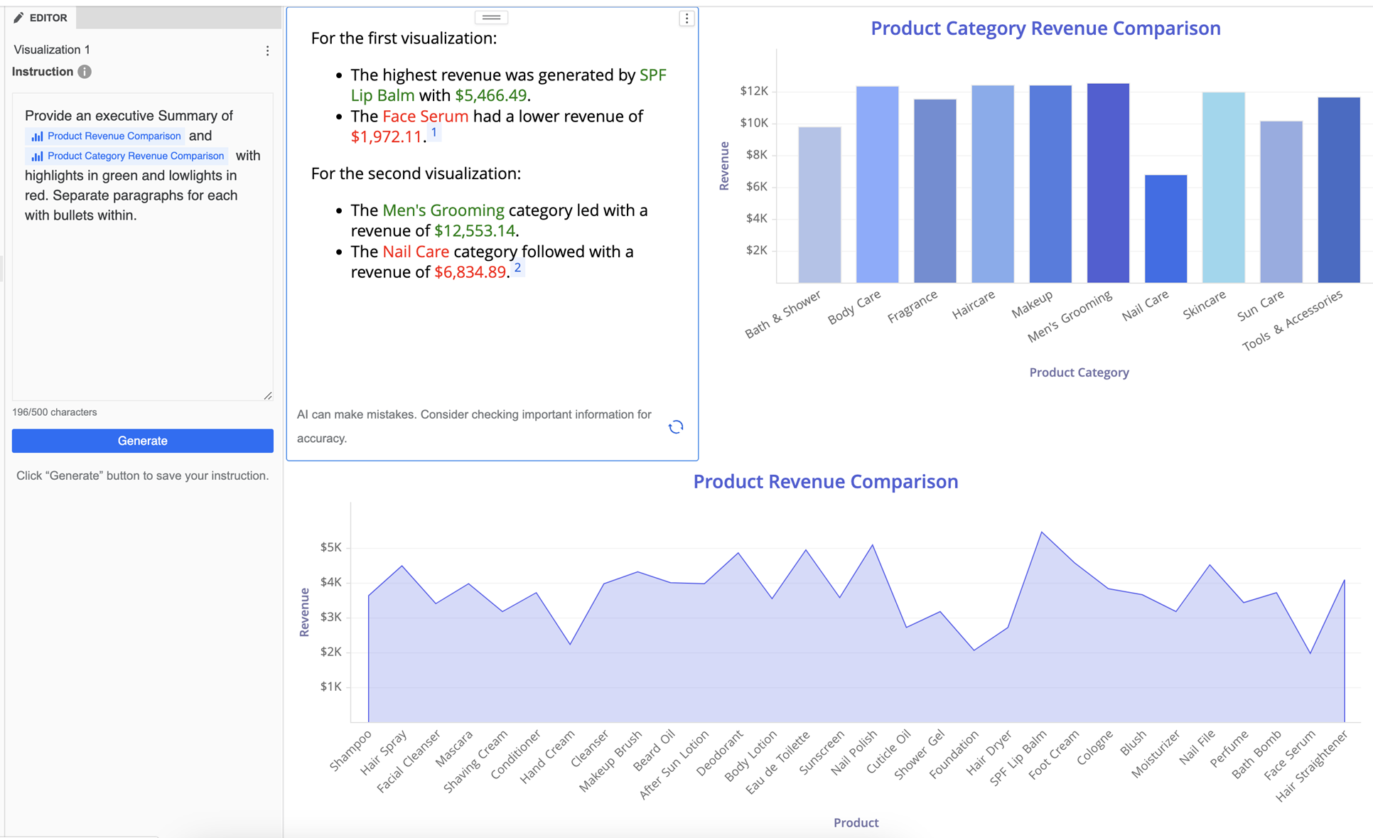 3. Nel riquadro Editor, immettere @ in Istruzione per selezionare la pagina corrente o visualizzazioni specifiche che si desidera vengano riepilogate nelle narrazioni automatiche. Descrivere la richiesta in dettaglio per identificare gli insight chiave e visualizzarli in un riepilogo formattato.