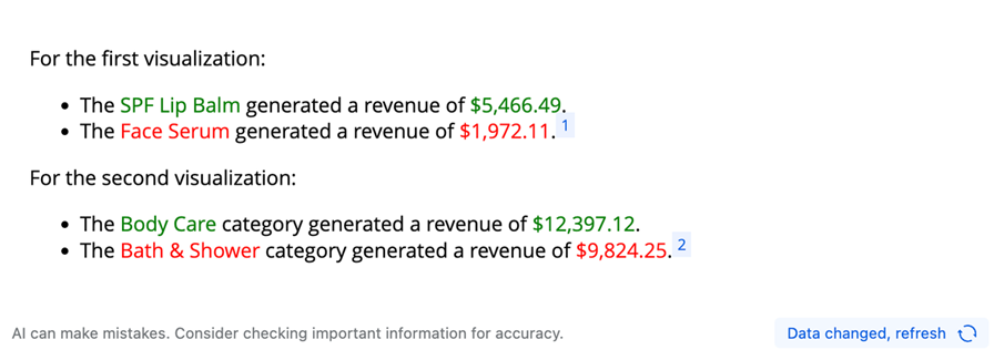 Le narrazioni automatiche semplificano l'interpretazione dei dati trasformando visualizzazioni complesse in riepiloghi in linguaggio naturale di facile comprensione. Ciò migliora l'accessibilità ai dati, riduce il tempo necessario per identificare gli insight chiave e rende i dati comprensibili agli utenti con qualsiasi background tecnico. Gli utenti possono generare riepiloghi personalizzabili per intere pagine di dashboard o visualizzazioni specifiche, garantendo la pertinenza e rispettando i filtri applicati. Le narrazioni vengono aggiornate quando cambiano i dati sottostanti, mantenendo la precisione e il contesto. Questo aiuta a velocizzare il processo decisionale e soddisfa le diverse esigenze degli utenti, dagli esperti alle parti interessate non tecniche.