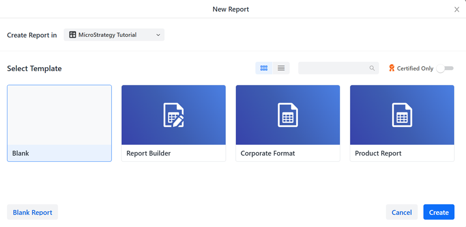 レポートがテンプレートとして設定されると、[新しいレポート] ウィンドウに表示されます。以下の例では、すぐに使用できる Blank と Report Builder テンプレート、およびユーザーが作成した Corporate Format と Product Report テンプレートが使用できます。