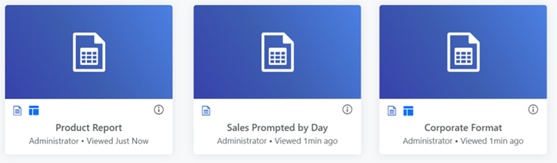 テンプレートが作成されるか、既存のレポートがテンプレートとして設定されると、テンプレート アイコン が表示されます。以下の画像では、Corporate Format と Product Report は両方ともテンプレートですが、Sales Prompted by Day はテンプレートではありません。