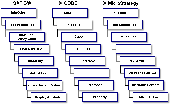 This diagram shows how SAP BW objects are exposed in ODBO and then how they are related to objects in the Strategy environment.