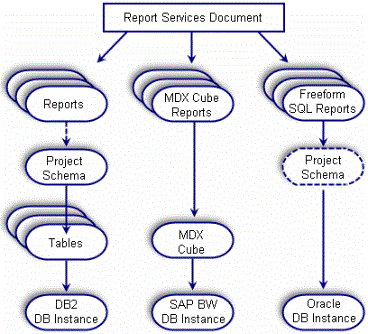 The MicroStrategy object model also shows how you can include any number of standard reports, Freeform SQL reports, Query Builder reports, and MDX cube reports in one Report Services document. By bringing these different types of reports together inside a document, report designers can create rich reports and analytics that take advantage of data from both data warehouses and MDX cube sources. You must import and map the data from MDX cubes into MicroStrategy in a manner that fits your data type conventions to support creating relationships between various MDX cube reports as well as between MDX cube reports and standard MicroStrategy reports (see About Defining Column Data Types for MDX Cube Data).