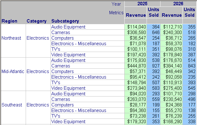 Some autostyles, such as Colorful and Accounting, have banding as part of their format. When one of these autostyles is applied to a report, the banding is applied to the report as well. For an introduction to autostyles, see the Advanced Reporting Help.