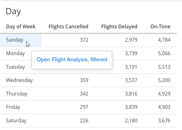 When you right-click Sunday in the Day grid, you can link to the Flight Analysis dashboard, filtered, as described in the tooltip. This link does pass the visualization filter selections.