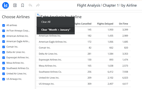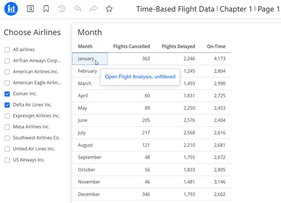 When you click the link, the by Airline page in the Flight Analysis dashboard opens. All airlines are selected in the Choose Airlines filter, so they all display in the grid. The link passed the selected month, January, as indicated by the grid's filter summary.