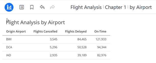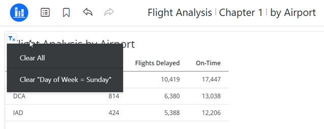 If you edit the contextual link to pass the filters to the by Airport page, the grid is filtered by the data point (Sunday) selected in the source grid. This page does not have a visualization filter, so the airlines are not passed.