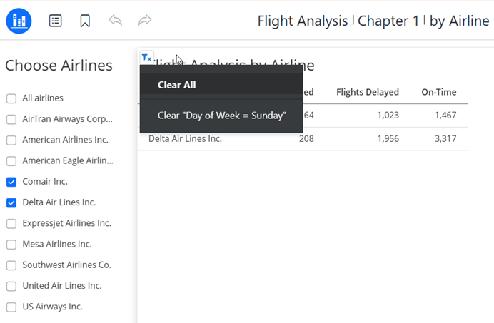 When you click the link, the same by Airline page in the Flight Analysis dashboard opens. Only Comair and Delta are selected in the filter, so the grid displays only those two rows. The link passed the selected day, Sunday, as indicated by the grid's filter summary, as well as the filter selections.