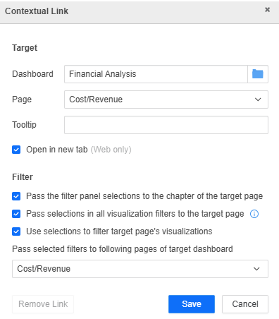 In the following image, the contextual link was created to the Overview page of the Financial Analysis dashboard. In the list of pages, that page is selected and unavailable for change. The entire Analysis chapter is now selected, so all its pages are filtered when the link is executed.
