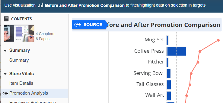 icon displays in the upper left corner of these visualizations. The names of the target visualizations appear on the banner at the top of the screen. You can target visualizations in a different chapter or page, but all targets must be on the same page as each other. Source