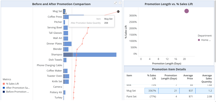A user clicks an item (in this example, Mug Set) in the Before and After Promotion Comparison bar chart. The Promotion Length vs. % Sales Lift bubble chart is filtered to display only the data for the mug set. The Mug Set row in the Promotion Item Details grid is highlighted, while the rest of the data remains viewable.