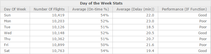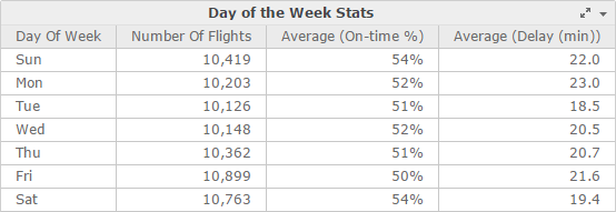 Your visualization allows you to view the number of flights for each day of the week, along with the percentage of on-time flights and the average delay in minutes.