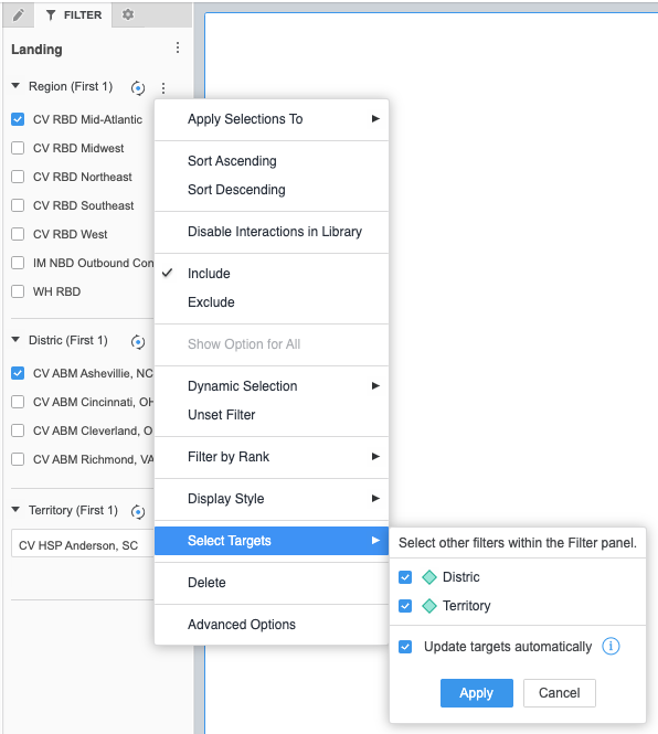 When you select Update Targets Automatically, the target attribute filter will automatically clear when you change selections in the parent. This is helpful when you are filtering hierarchies, such as Geography. This behavior forces you to make a new lower level selection of the hierarchy, such as State, when a higher level selection of the hierarchy, such as Region, is updated.