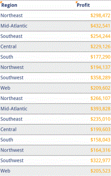 In this widget, attributes and metric values are displayed in the columns and rows, and grouping appears at the top of the screen. The widget above is grouped by Region.